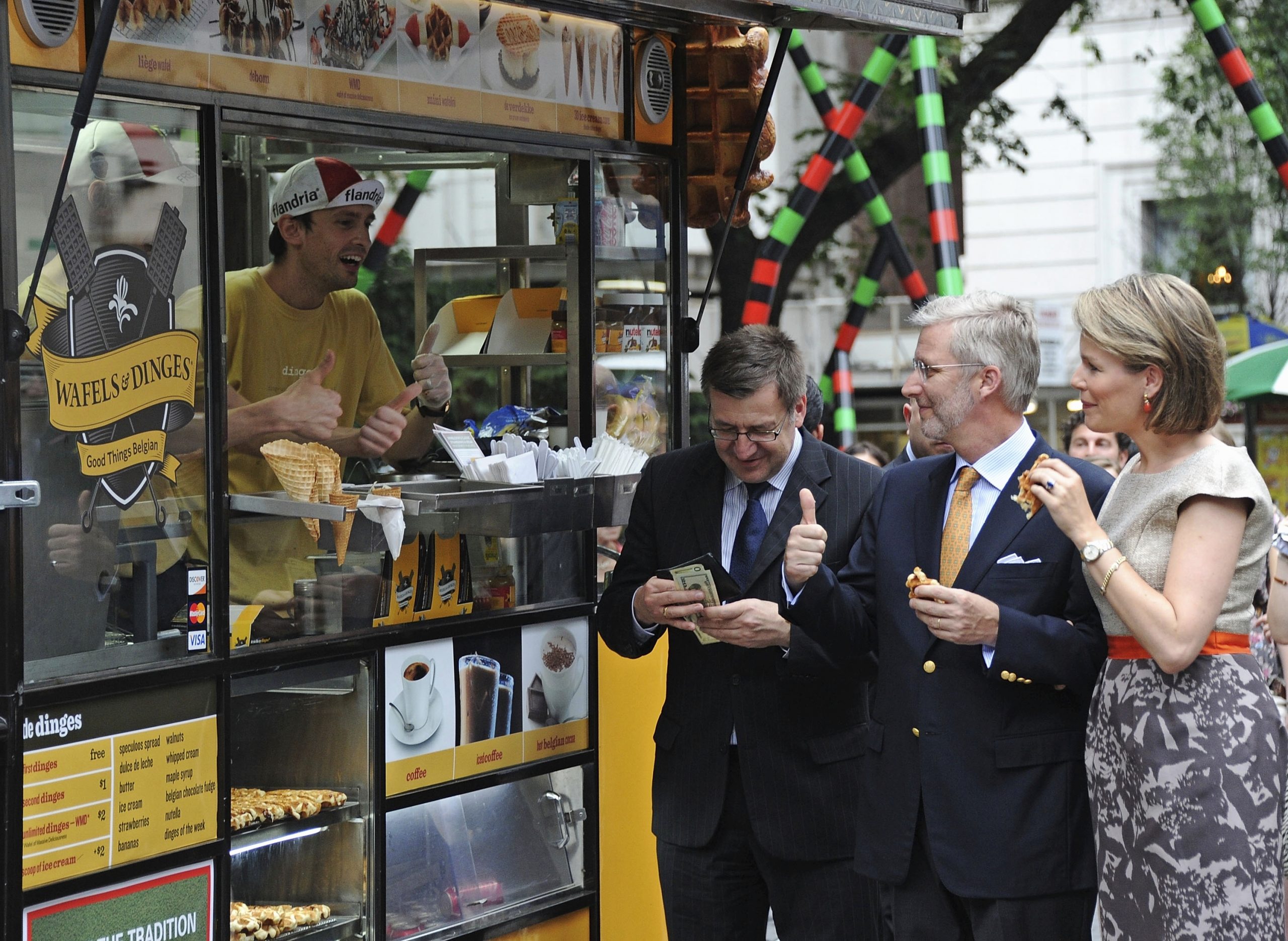 Desgevraagd verduidelijkt zijn entourage mij dat koning Filip bij officiële activiteiten zijn handen graag vrijhoudt, en dus geen portemonnee in zijn zakken draagt. (In zijn vrije tijd en bij privé-uitstappen betaalt hij zijn uitgaven wel uit eigen zak.) Filip is in Waver om lokale handelaars en marktkooplieden te spreken die in de coronacrisis zo zwaar getroffen zijn. Hij bestelt ook en betaalt – opnieuw met hulp van zijn adjunct-kabinetschef – een gebraden kip aan een eetkraam. Een gelijkaardig voorbeeld uit 2011. De toenmalige prins Filip is op handelsmissie in New York. Aan een wafelkraam in Central Park bestelt hij een zoete lekkernij voor zichzelf en Mathilde – 5 dollar per stuk. Terwijl hij zijn tanden in de wafel zet, haalt de minister van Buitenlandse Zaken de dollarbiljetten boven. Hij vereffent de rekening.