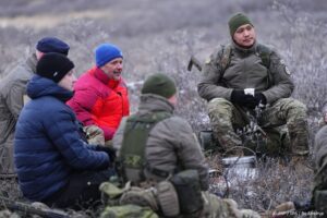 Frederik praat en lacht rond kampvuur met militairen in Groenland