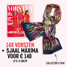 De satijnen sjaal met de illustraties van Linda Zoon heeft een winkelwaarde van €140. Als u nu een abonnement op Vorsten neemt, betaalt u voor 14 nummers en de sjaal samen slechts €140. Dat is een korting van 41%! Natuurlijk kunt u de sjaal ook zonder abonnement bestellen. U vindt de mogelijkheden in de shop van Vorsten. Abonnees krijgen een speciale korting: hierover hebben ze inmiddels bericht ontvangen. Hebt u als abonnee dat bericht even gemist? Neem dan contact op via info@vorsten.nl.
