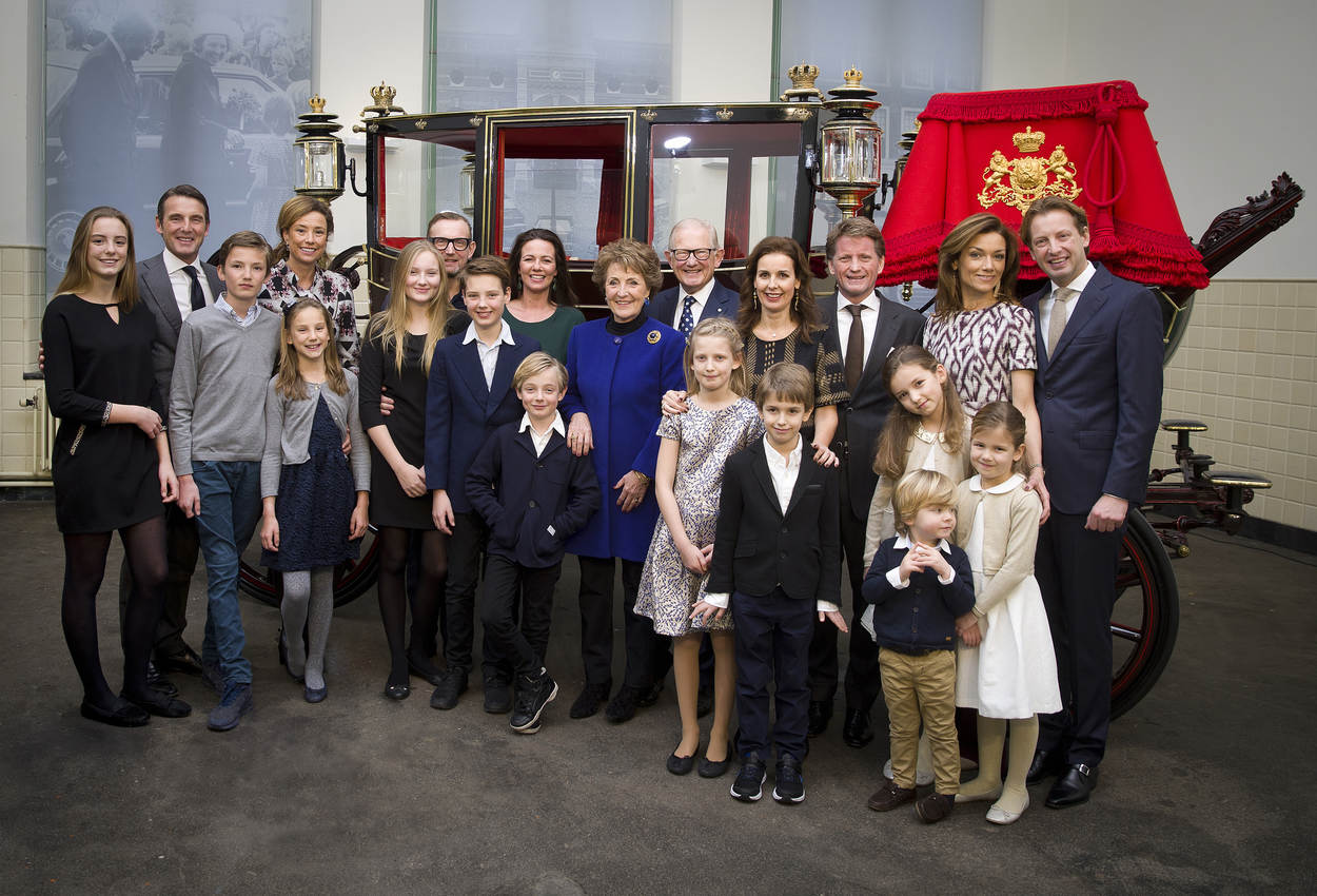 De familie poseert bij de Gala Glas Berline, de koets die op 10 januari 1967 werd gebruikt tijdens hun huwelijk. Op de foto staan van links naar rechts: Anna, Prins Maurits, Lucas, Prinses Marilène, Felicia, Isabella, Prins Bernhard, Samuel, Prinses Annette, Benjamin, Prinses Margriet, prof.mr. Pieter van Vollenhoven, Emma, Prinses Anita, Pieter, Prins Pieter-Christiaan, Magali, Willem Jan, Prinses Aimée, Eliane en Prins Floris.
