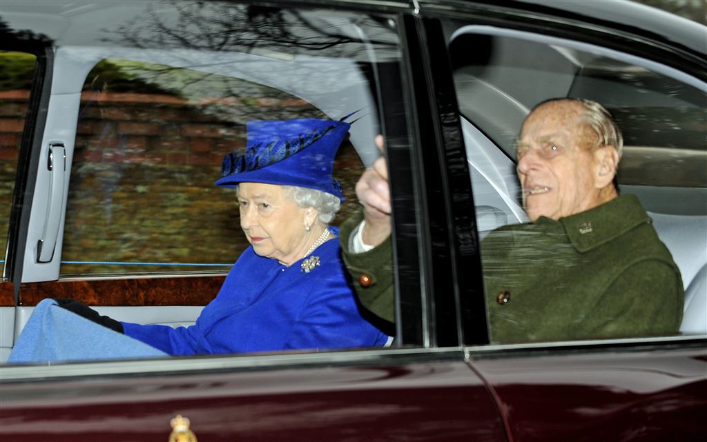 Elizabeth en Philip arriveerden zondag bij de kerk in een kastanjebruine Bentley. Veel belangstellenden wachtten de koninklijke familie op.