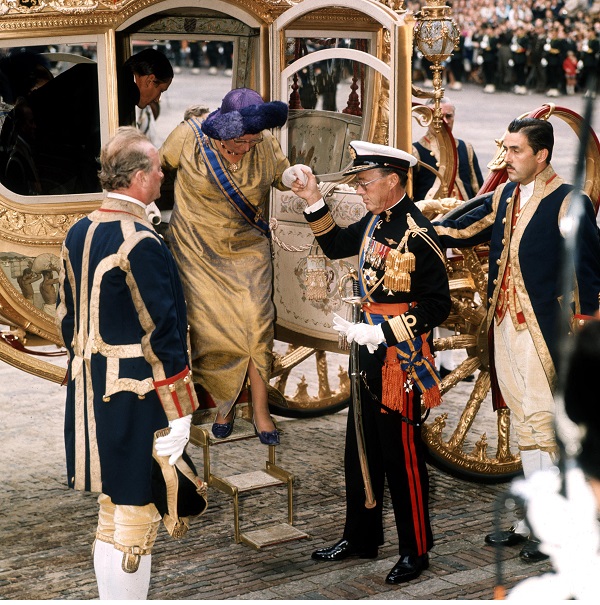 1975-09-01 00:00:00 Koning Juliana stapt uit de gouden koets geholpen door prins Bernhard. Prinsjesdag. (exacte beelddatum onbekend)