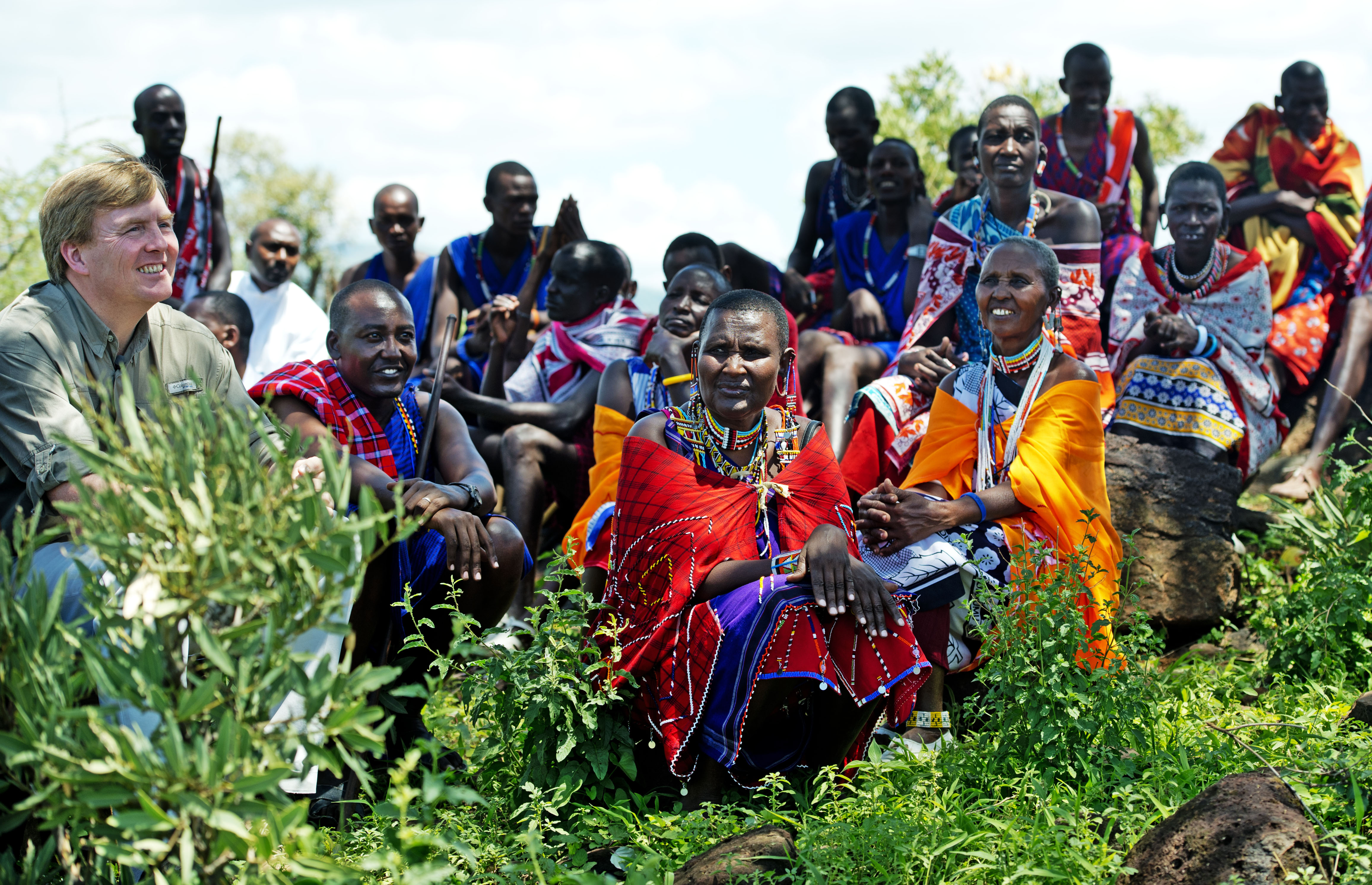 2012-11-30 00:00:00 OL DONYO NYOIKE - Prins Willem-Alexander ontmoet vertegenwoordigers van het Masai-volk in het dorp Ol Donyo Nyoike in het district Magadi tijdens een veldbezoek aan een project van Flying Doctors. De prins was in Kenia voor een vergadering van de Adviesraad van de Secretaris-Generaal van de Verenigde Naties over water en rioolwaterzuivering in Nairobi. ANP ROYAL IMAGES ROBIN UTRECHT