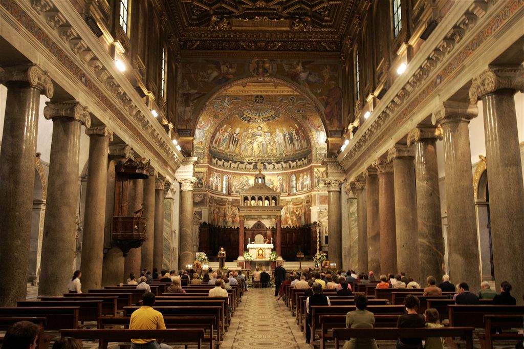 De basiliek aan een plein in het oude stadsdeel Trastevere – ‘aan de overkant van de Tiber’ – is regelmatig herbouwd, maar bevat nog mozaïeken uit de tijd van de Romeinen en afkomstig uit Romeinse badhuizen. Veel kardinalen en ook pausen hebben in de basiliek hun laatste rustplaats.