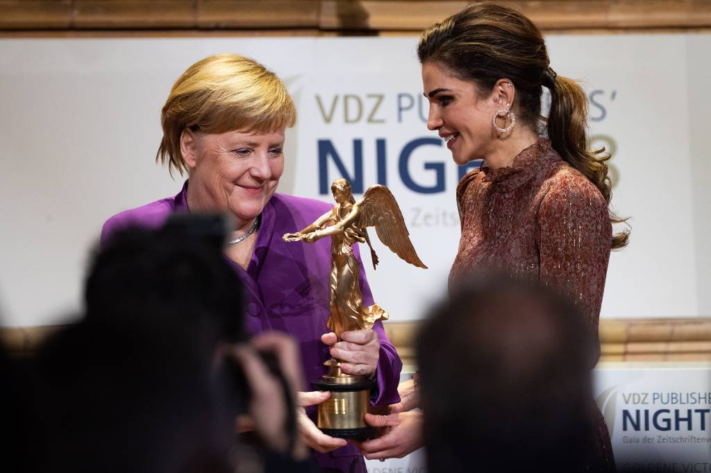 De Jordaanse koningin prees de leiderschapsstijl van Merkel en haar bijdrage aan de aanpak van mondiale problemen, waaronder de vluchtelingencrisis, de financiële onrust, terroristische aanslagen en gewelddadige conflicten.