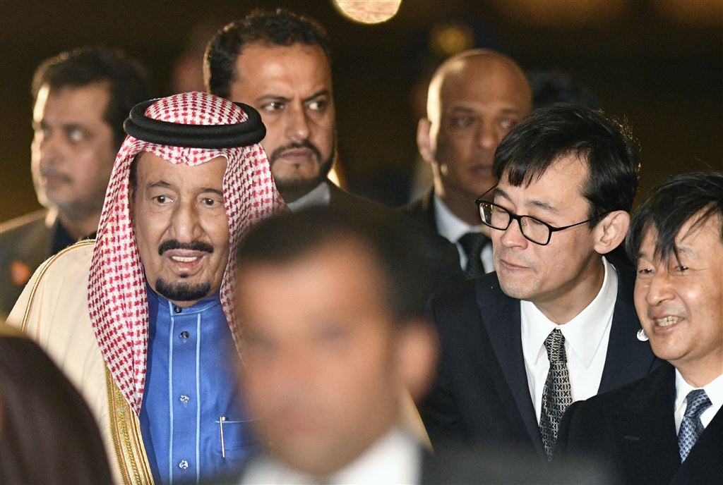 Koning Salman van Saudi-Arabië is zondag aangekomen in Tokio voor zijn driedaagse bezoek aan Japan. Op het vliegveld rolde hij van zijn gouden roltrap het vliegtuig uit en werd hij opgewacht door de Japanse kroonprins Naruhito.