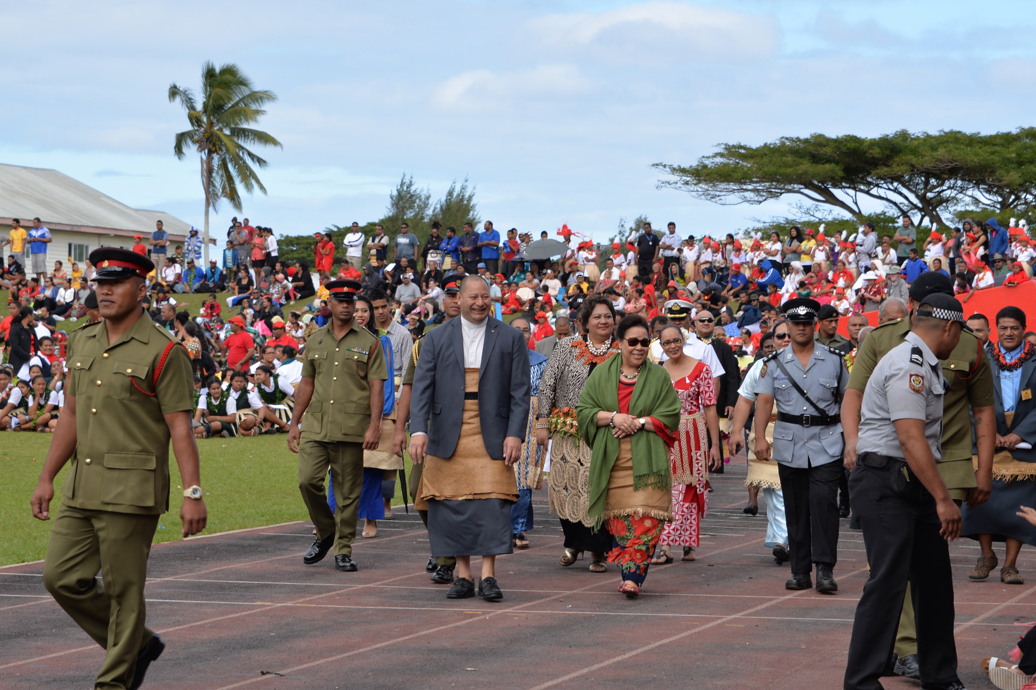 2015-07-01 09:46:02 Tonga's King Tupou VI (centre L) and Queen Nanasipau'u (centre R) attend a day of traditional dancing and entertainment by hundreds of schoolchildren for "Education Day" at the Teufaiva Stadium during the week-long coronation celebrations in Nuku'alofa on July 1, 2015. Tonga is in the middle of a week of celebrations to mark the upcoming coronation of the Pacific nation's monarch, King Tupou VI on July 4, 2015. AFP PHOTO / PESI FONUA