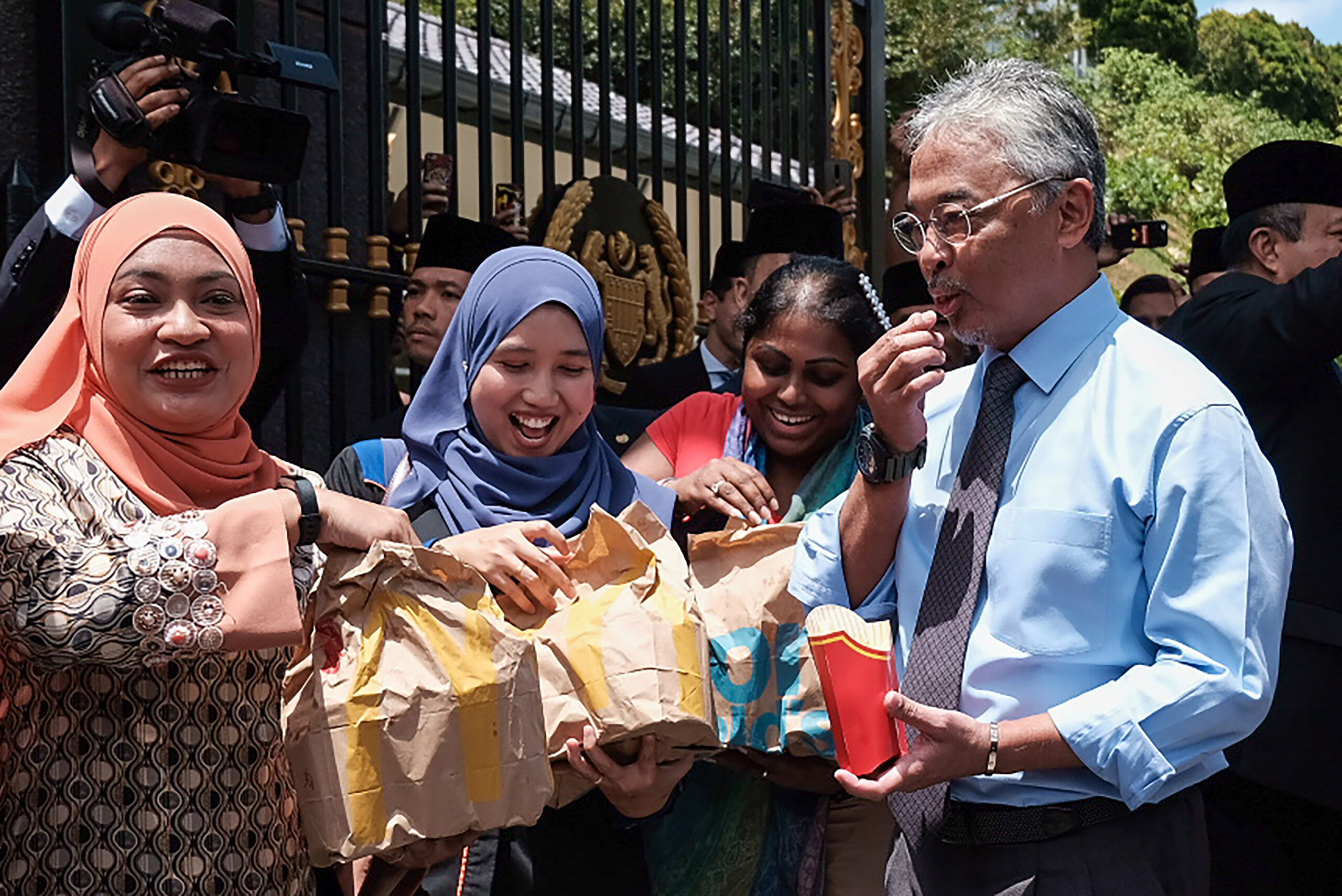 De Maleisische koning, sultan Abdullah, kan zo aan de slag bij McDonald’s. Dat toonde hij dinsdag bij de poort van het koninklijk paleis Istana Negara. De koning kwam daar drankjes en ‘happy meals’ brengen voor de wachtende media. “Een klein gebaar”, noemde de Yang di-Pertuan Agong, de koning, het uitdelen van de maaltijden.