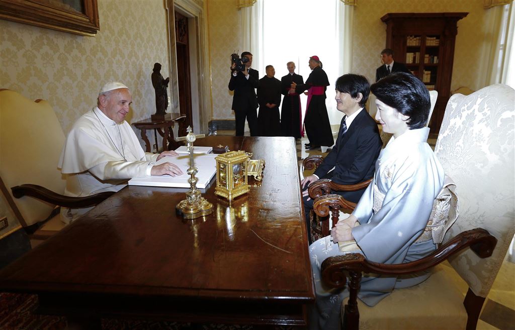 Prins Akishino van Japan en zijn echtgenote Kiko zijn donderdagochtend op audiëntie geweest bij paus Franciscus in het Vaticaan.