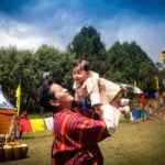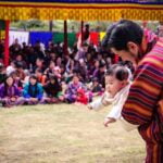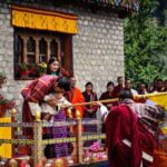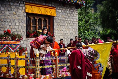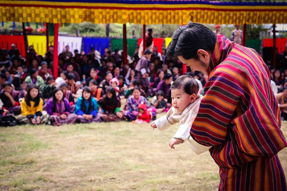“Mensen van heinde en ver vieren het op traditionele wijze met zang en dans en hebben hun beste kleding aangetrokken”, heeft het koningspaar bij de foto geschreven. De koning en de koningin reizen door het koninkrijk in de Himalaya om hun zoon te introduceren aan het volk. Het is de eerste keer dat Jigme Nagyel Chumey, het huis van zijn moeder, bezoekt.