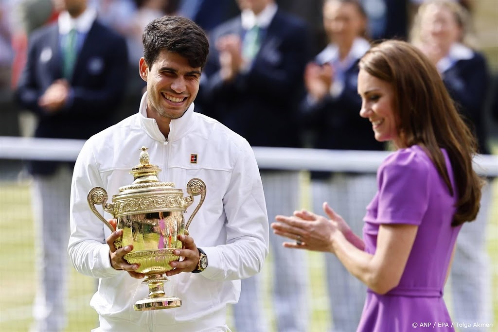 Onder toeziend oog van diverse internationale bekendheden, heeft prinses Catherine zondagmiddag bij de finale van Wimbledon de winnaarsbokaal uitgereikt aan Carlos Alcaraz. De Spaanse tennisser was in drie sets te sterk voor zijn Servische tegenstander Novak Djokovic.