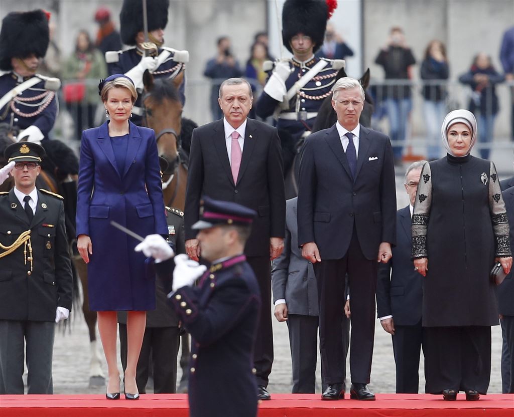 BRUSSEL – Koning Filip van koningin Mathilde van België hebben maandagochtend de Turkse president Recep Tayyip Erdogan en zijn vrouw ontvangen in het Koninklijk Paleis in Brussel.