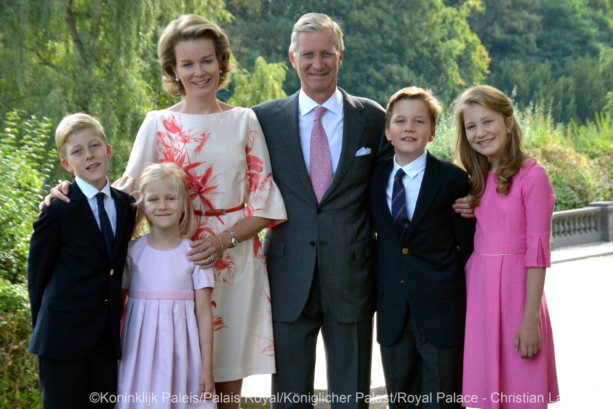 Koning Filip en koningin Mathilde doen de wensen vergezeld gaan van een familiefoto die eerder dit jaar in de paleistuin is gemaakt, en waarop het koninklijk gezin de fotograaf Christian Lambiotte vrolijk toelacht.