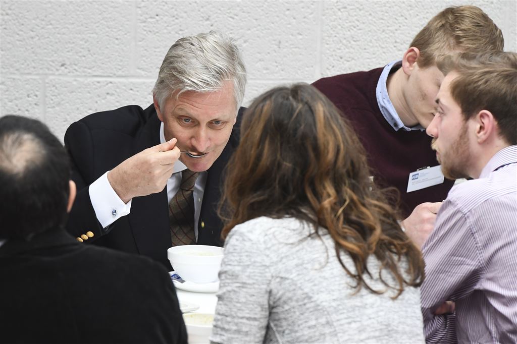 Tijdens het hoofdgerecht sprak hij met leden van de studentenraad, maar ook internationale studenten over hun rechten binnen de universiteit. Aan de laatste tafel sprak hij met enkele jonge studerende ondernemers.