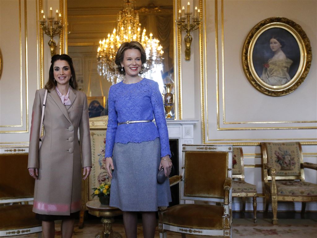 BRUSSEL – Koningin Rania van Jordanië ging dinsdagmiddag langs bij koningin Mathilde van België. Mathilde ontving Rania voor een lunch op het Koninklijk Paleis in Brussel.