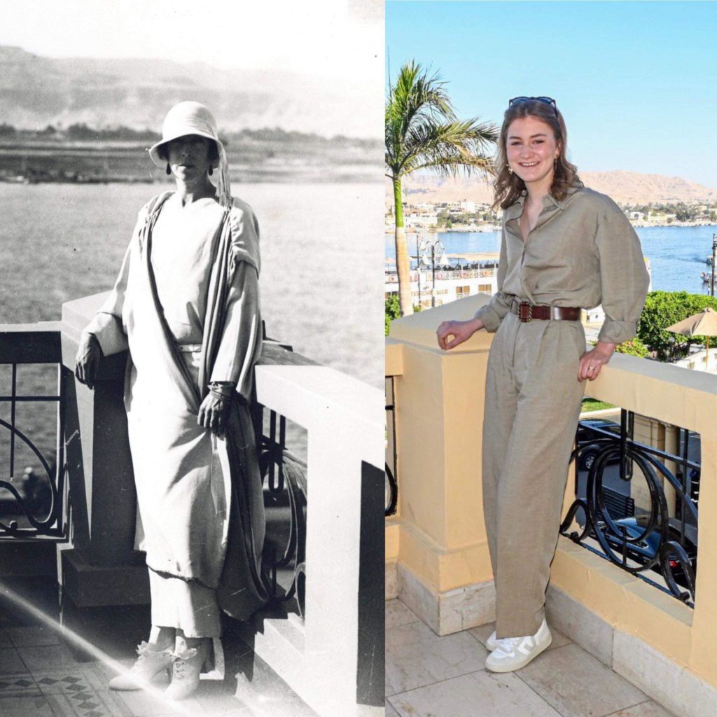 Koningin Mathilde van België en haar dochter prinses Elisabeth hebben op de eerste dag van hun gezamenlijke bezoek aan Egypte op precies dezelfde plaats geposeerd als koningin Elisabeth honderd jaar geleden deed. Het resultaat deelt het hof woensdagochtend via sociale media.