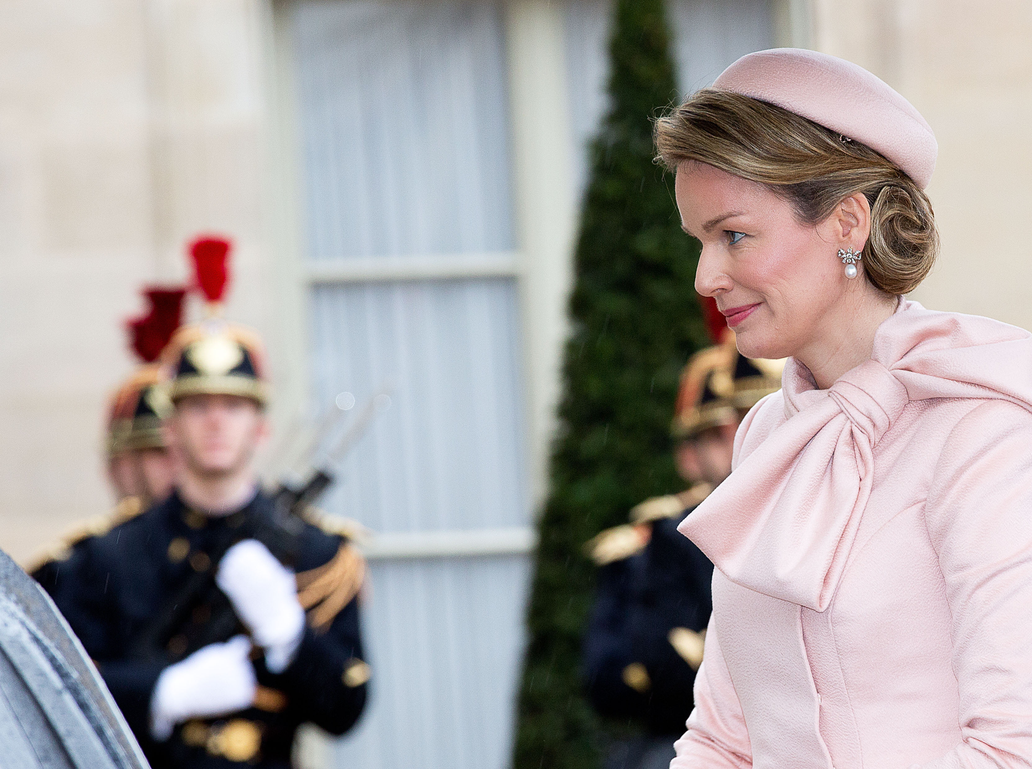 Koning Filip en koningin Mathilde brachten vandaag in Parijs een bezoek aan de Franse president Hollande. Voor de gelegenheid koos de stijlvolle koningin een creatie van de Belg Raf Simons, die werkzaam is voor het Franse modehuis Dior. Door te kiezen voor deze ontwerper maakt Mathilde een mooie geste naar het gastland en laat ze bovendien zien dat ook haar landgenoten op het gebied van mode veel te bieden hebben. Een echte win-winsituatie dus.