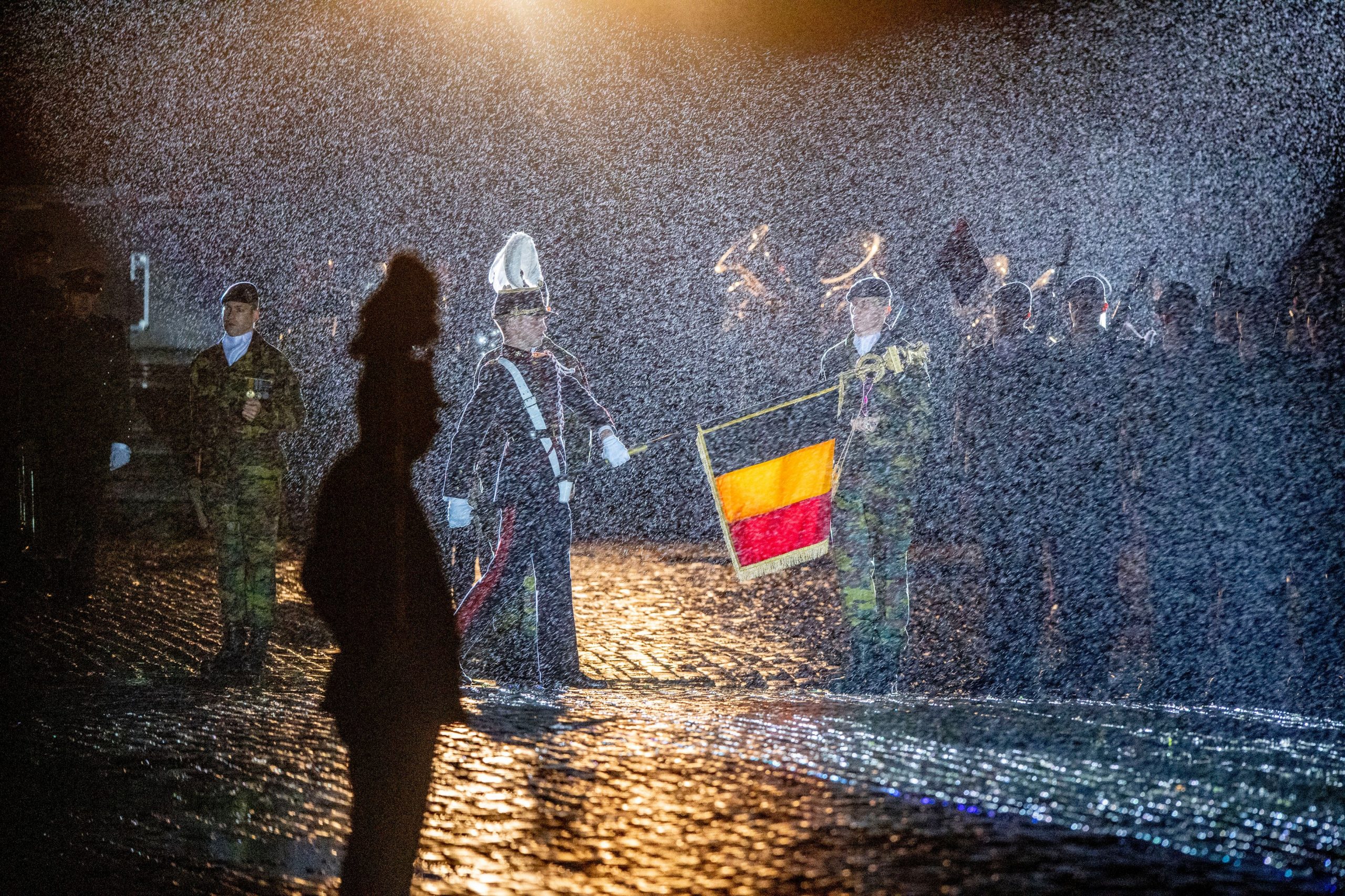 De Belgische koninklijke familie, allen voorzien van mondkapjes, heeft donderdagavond op het kletsnatte Esplanadeplein van het Jubelpark in Brussel de plechtige intrede en opening van het academisch jaar bijgewoond van de Koninklijke Militaire School.