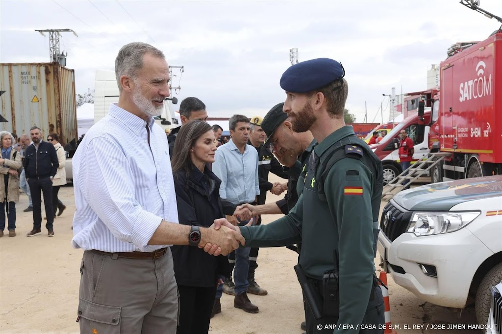 Koning Felipe, koningin Letizia, premier Pedro Sánchez en president van de regio Valencia, Carlos Mazón, bezochten op zondag het dorp Paiporta. Daar protesteerde een groep mensen, die ook met modder gooide. Volgens de Spaanse krant El Mundo is een beveiliger van de koning gewond geraakt aan zijn hoofd.