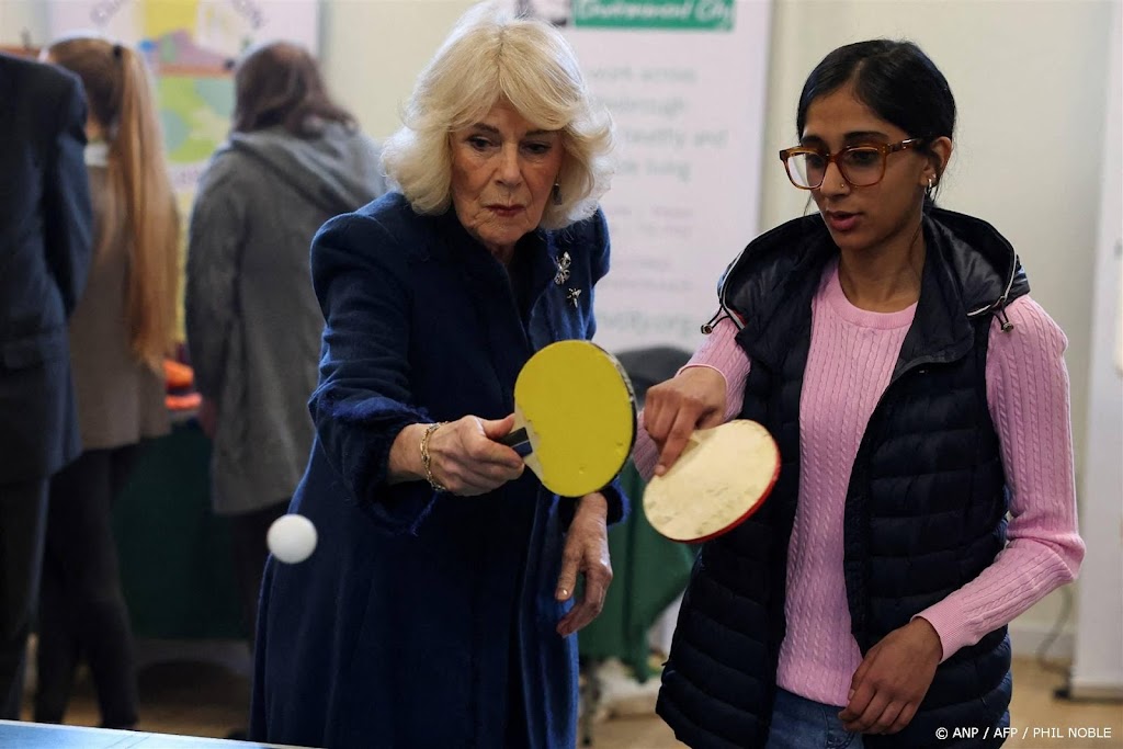 De Britse koningin Camilla heeft donderdag de verleiding niet kunnen weerstaan om een potje te tafeltennissen toen ze een gemeenschapscentrum in Middlesbrough bezocht. Ze voegde zich bij een groepje tieners voor een spontaan wedstrijdje, meldt het Britse persbureau PA.