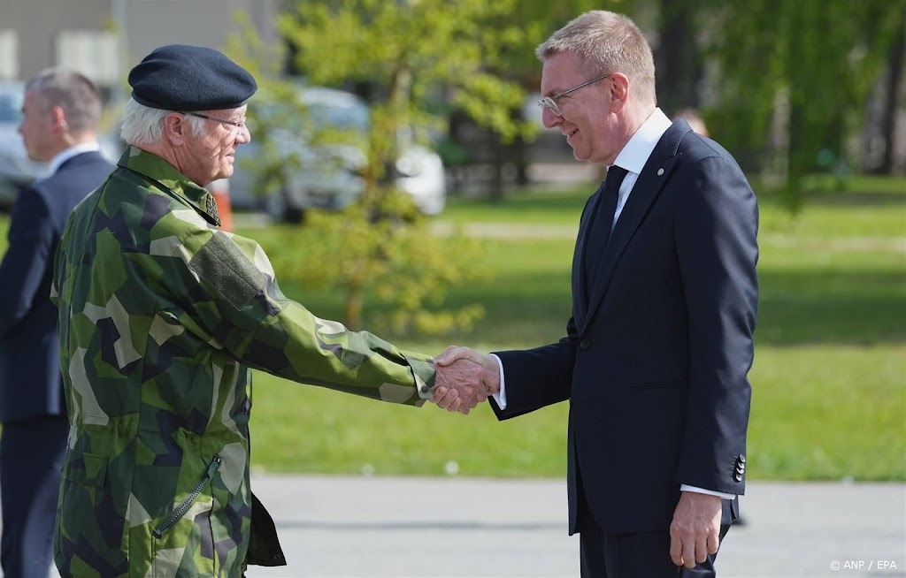 Koning Carl Gustaf heeft donderdag een bezoek gebracht aan de Zweedse militairen die zijn gestationeerd op de militaire basis in Letland. Op basis Adazi werd hij welkom geheten door de Letse president Edgars Rinkēvičs. Voor de gelegenheid had de koning een camouflagepak aangetrokken.