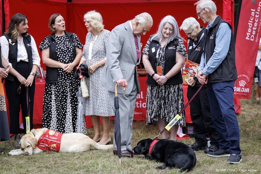 Fotografen legden vast hoe het koninklijke paar handen schudde met mensen die in de rij stonden om hen te begroeten en hoe ze een paar honden aaiden. De viervoeters horen bij de organisatie Medical Detection Dogs, die honden traint om de geur van ziektes bij mensen te detecteren om zo een snellere diagnose te verkrijgen.