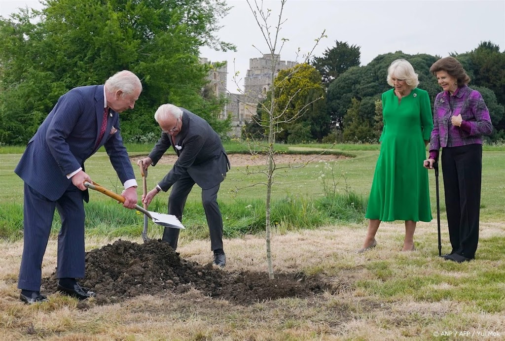 Koning Charles en koning Carl Gustaf hebben donderdag de handen uit de mouwen gestoken. Onder toeziend oog van hun vrouwen Camilla en Silvia plantten de koningen een boompje in de tuin van Windsor Castle.