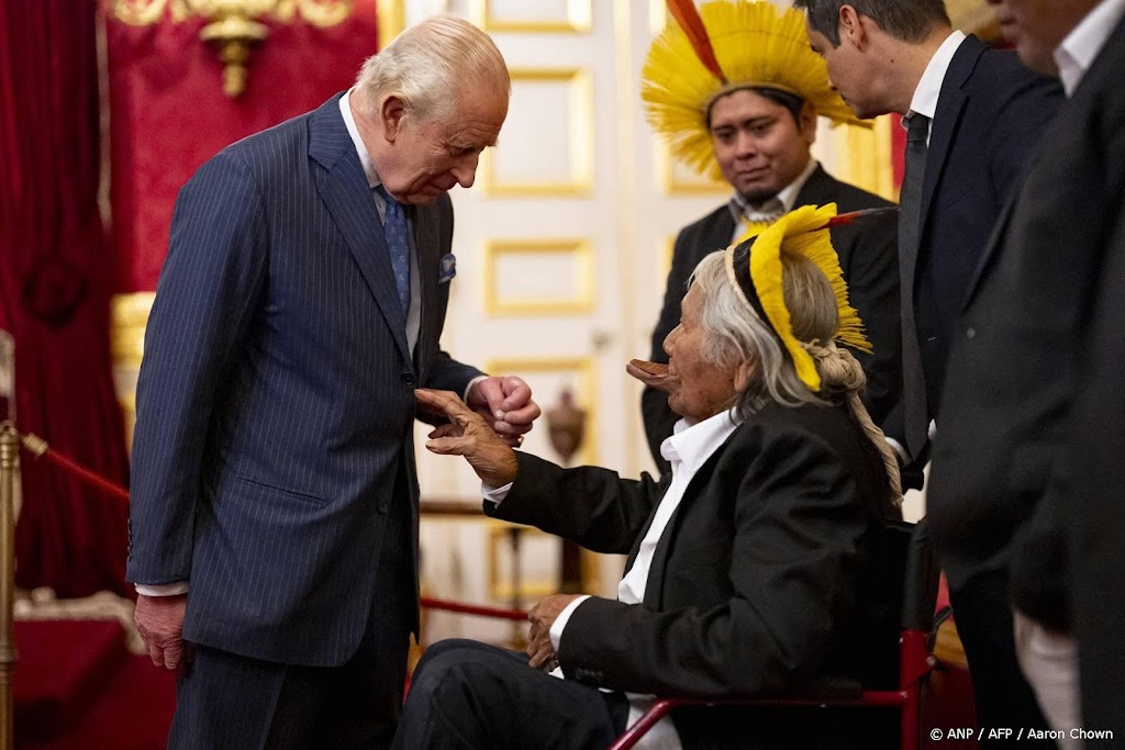 Koning Charles heeft tijdens een receptie op St James’s Palace in Londen een ontmoeting gehad met de inheemse Braziliaanse leider en milieuactivist Raoni Metuktire. Hij is een van de stamhoofden van het Kayapo-volk dat leeft in een beschermd reservaat in Brazilië.