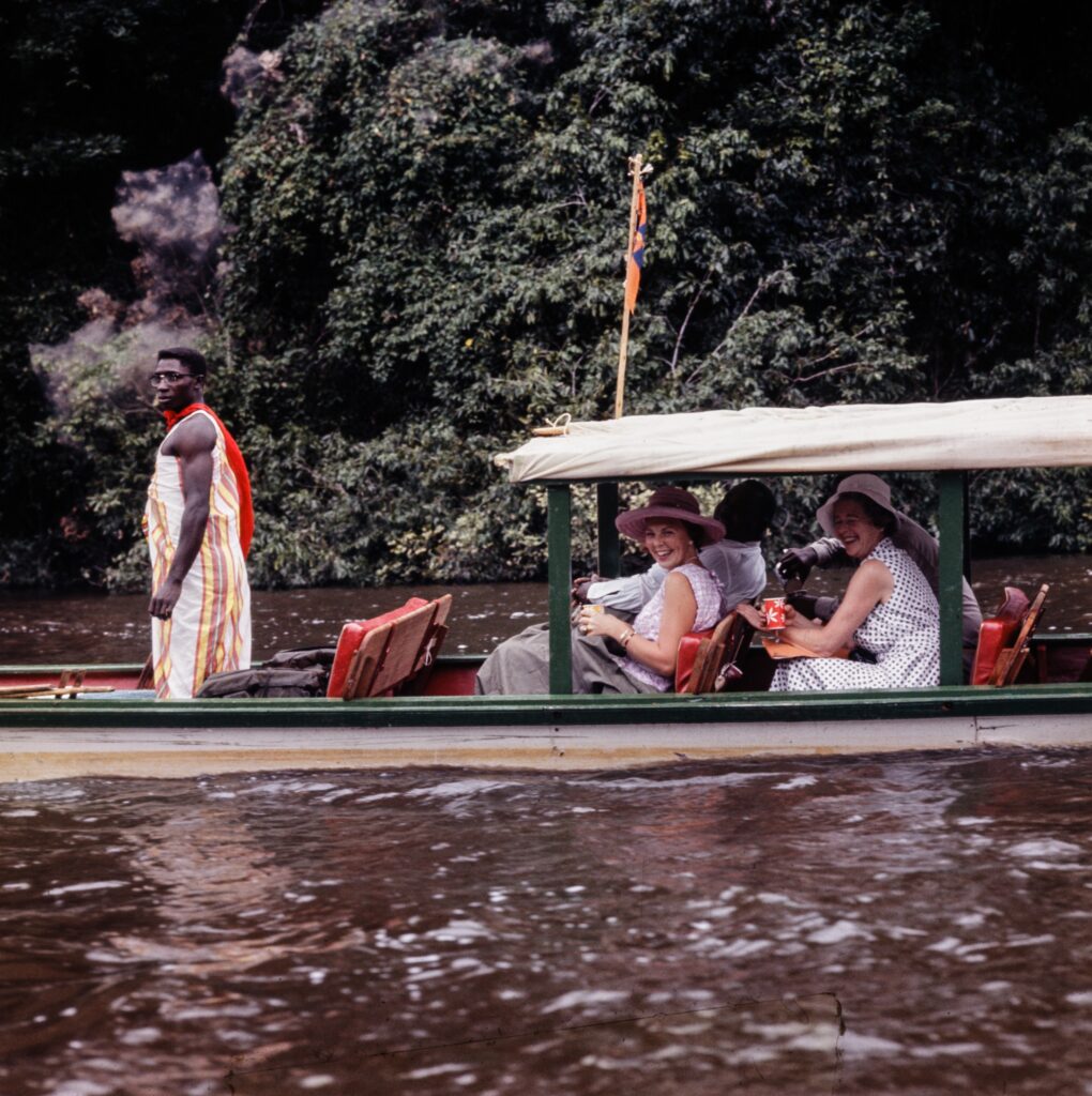 6 maart 1965. Prinses Beatrix vaart in een salonboot op de Nickerie-rivier naar Wageningen.