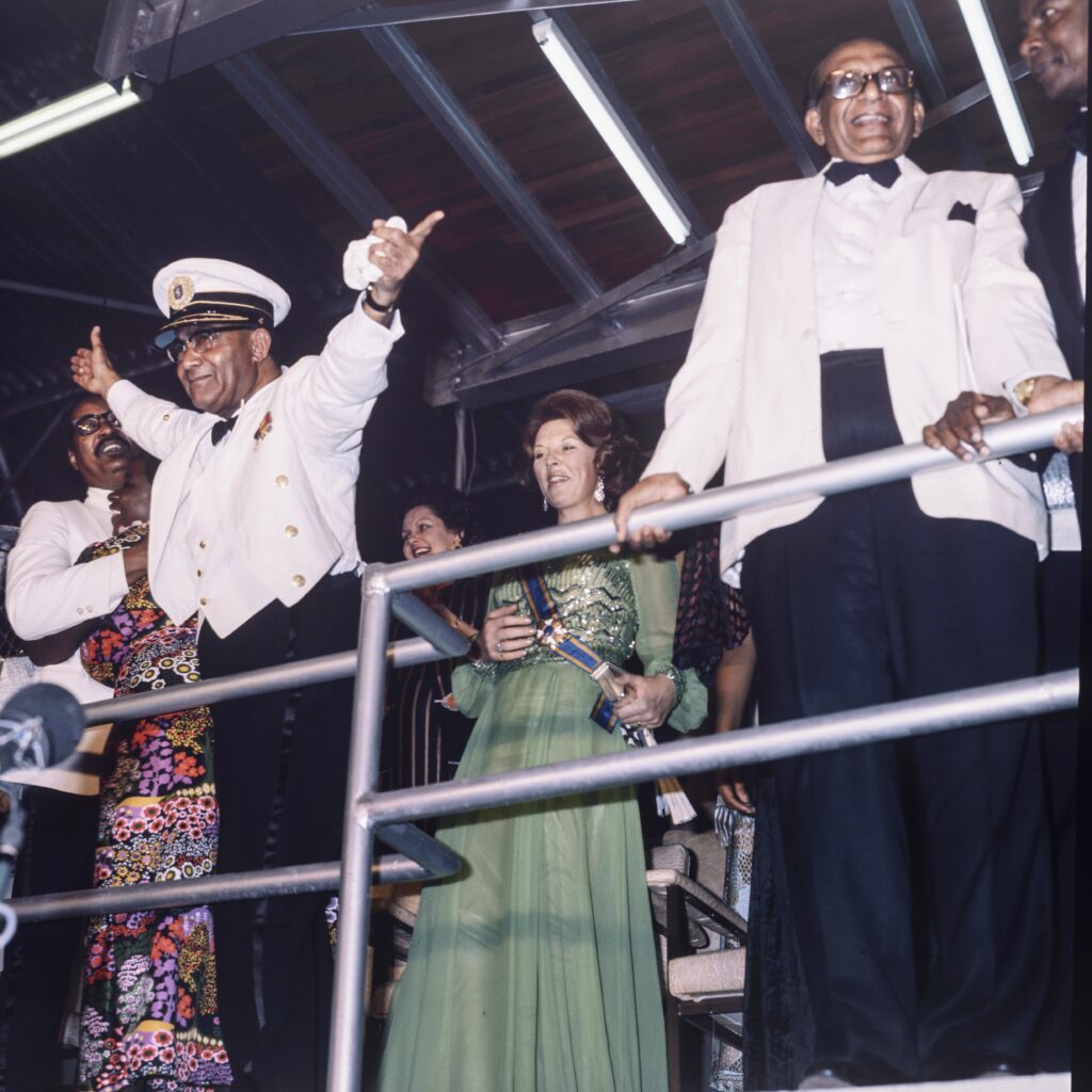 25 november 1975. Suriname is om middernacht onafhankelijk geworden na 308 jaar Nederlandse bemoeienis. Op de eretribune staat prinses Beatrix tussen president Ferrier en oppositieleider Lachmon