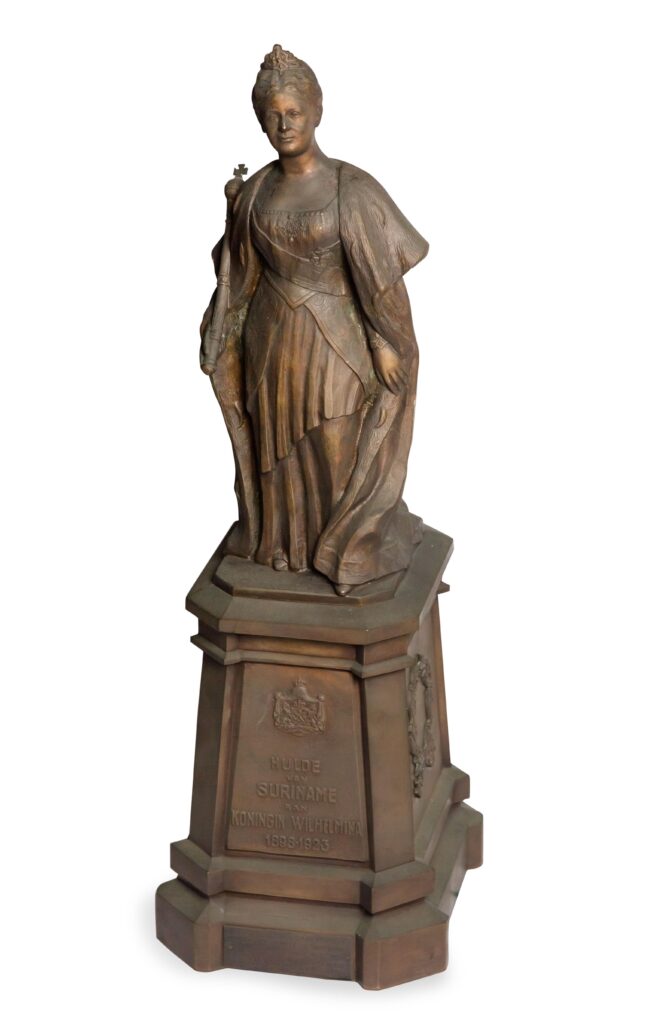 In 1923 viert Wilhelmina haar 25-jarig regeringsjubileum. Een comité in Suriname biedt de koningin een bronzen standbeeld aan, dat in augustus van dat jaar onthuld wordt op het Gouvernementsplein in hoofdstad Paramaribo. Wilhelmina zal de reis naar Suriname nooit maken, maar dankzij een miniatuur dat ze ontvangt, weet ze wel hoe het beeld eruitziet. Ze vindt de verre reis te riskant, ze wil dochter Juliana liever niet alleen in Nederland achterlaten en ze heeft ook gewoon een hekel aan hitte. Surinamers horen dus over hun koningin via verhalen en foto’s, of ze kijken vanaf 1923 naar de bronzen rijzige dame in mantel met een scepter in haar hand. Na de onafhankelijkheid in 1975 wordt het plein tot Onafhankelijksplein omgedoopt en Wilhelmina’s beeld verplaatst naar Fort Zeelandia. Op de plek van het beeld verrijst een mast met de nieuwe Surinaamse vlag.