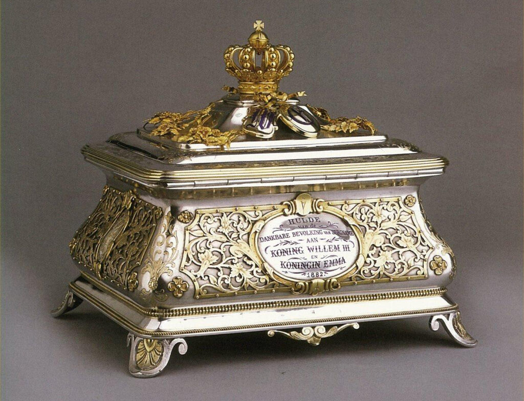 ‘Hulden van de dankbare bevolking van Suriname aan koning Willem III en koningin Emma 1882’, staat er op het zilveren juwelenkistje dat Emma – ietwat verlaat – van de inwoners van Suriname krijgt voor haar huwelijk in 1879. Het kistje is met goud versierd en opent met een gouden sleutel. Het goud is gedolven in Suriname, en is op dat moment het belangrijkste exportproduct van de kolonie. Het echtpaar komt er nooit, maar in Suriname heerst grote dankbaarheid richting Willem III. Dankzij enthousiaste verhalen van lokale bestuurders is hij de held van de afschaffing van de slavernij in 1863. Echte bewijzen dat hij zich persoonlijk hard heeft gemaakt voor de vrijlating van zo’n 30.000 Surinaamse tot slaaf gemaakten ontbreken, volgens historici. Het is aannemelijker dat hij enkel de Emancipatiewet ondertekende die het parlement had opgesteld en die vervolgens als een persoonlijke bevrijdende boodschap van vorst aan volk werd verkondigd. Toch hebben Surinamers generaties lang koning Willem III als de bevrijder in het verhaal bezongen, en met hem het hele Nederlandse koningshuis.
