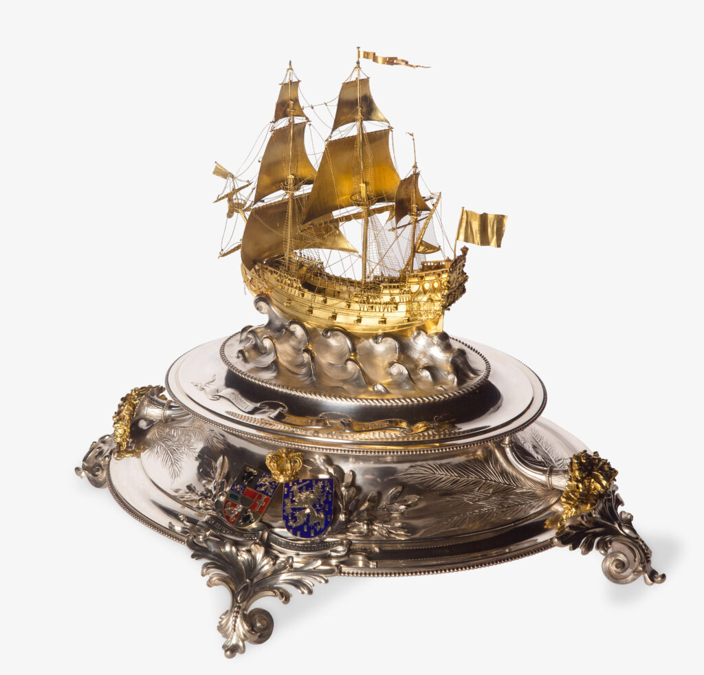 Ter gelegenheid van haar huwelijk met prins Hendrik in 1901 krijgt koningin Wilhelmina ‘dit stoffelijk blijk der verknochtheid van Suriname’s bevolking’ van welgestelde inwoners van Suriname. De gouden koop- vaardijdriemaster in een zilveren zee wordt gemaakt in Nederland, maar het goud komt uit Suriname. Tegenwoordig is het ontwerp vooral een herinnering aan een zwarte kant van de Nederlandse handels- zucht: het scheepsmodel is geïnspireerd op het wapenschild van de kolonie Suriname. Het schip uit het wapen illustreert de Neder- andse betrokkenheid bij de trans-Atlantische driehoekshandel: vanaf de 17de eeuw vertrokken dit soort schepen vol met wapens, buskruit, drank en stoffen vanuit de Republiek naar de West- Afrikaanse ‘goudkust’. Daar werden de spullen geruild voor tot slaaf gemaakte Afrikanen, die vervolgens aan plantagehouders in Suriname werden verkocht.