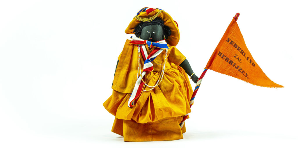In 1943, tijdens de oorlog, zet prinses Juliana voor het eerst voet op Surinaamse grond, en daarmee dus op onbezette vaderlandse bodem. En hoe ver weg Nederland ook is − aan de andere kant van de wereld − leeft ook bij de bewoners van Suriname de Duitse bezetting van een groot deel van Europa. Zo zijn de bauxietmijnen in Suriname een belang rijke grondstoffenbron voor de Amerikaanse vliegtuigbouw. Daarnaast dienen Surinaamse vrijwilligers als militair in de strijd tegen de Duitsers en Japanners. Juliana ontvangt tijdens haar bezoek van de lokale bevolking enkele zogenoemde kotomisi-poppen voor haar poppenverzameling. Een Afro-Surinaamse vrouw die de traditionele koto draagt, bestaande uit een rok, jasje en hoofddoek, wordt een kotomisi genoemd. De afgebeelde pop houdt een vlaggetje vast met de tekst ‘Nederland zal herrijzen’.