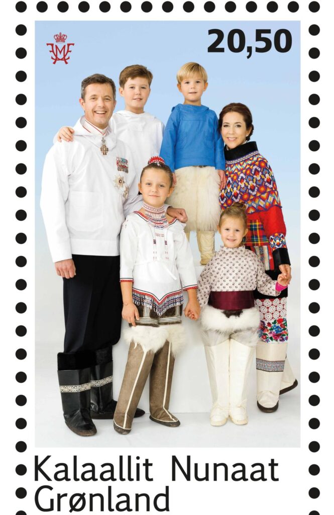 Het jonge gezin op een postzegel van Groenland. Mary heeft inmiddels een blauw zijden lint om haar middel toegevoegd. Volgens de traditie een teken dat ze ouder wordt.