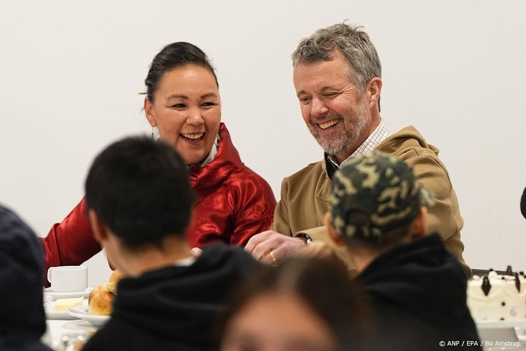 Het Deense koningshuis heeft foto’s gedeeld van de tweede dag van het bezoek van koning Frederik aan Groenland. Op de foto’s draagt de koning een jas met zowel de Deense als de Groenlandse vlag en drinkt hij onder meer koffie met inwoners van de stad Maniitsoq.
