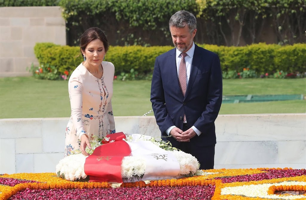 De Deense kroonprins Frederik en kroonprinses Mary hebben maandag bij het monument van Mahatma Gandhi in New Delhi een krans gelegd. Het paar strooide ook rozenblaadjes op de plaats waar de Indiase vrijheidsstrijder in 1948 werd gecremeerd.