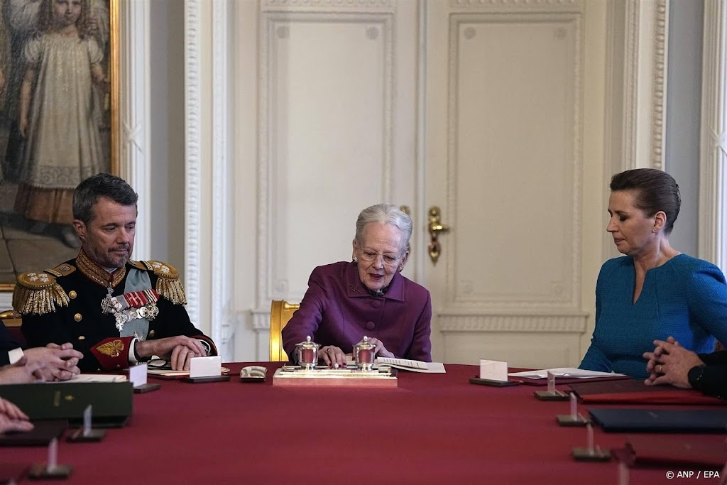 Tijdens haar toespraak bedankte Frederiksen ook koningin Margrethe, die rond 14.00 uur zondagmiddag een abdicatieverklaring had getekend. Vanaf dat moment was Frederik koning van Denemarken.