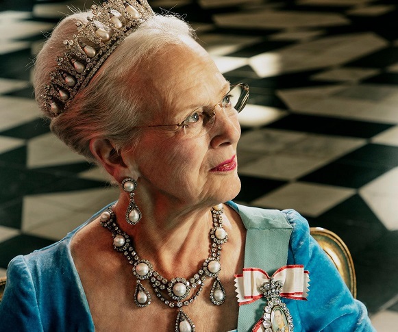 De foto werd door fotograaf Morten Abrahamsen genomen op het slot Fredensborg. Margrethe kijkt op het portret opzij en draagt een blauwe jurk. Ook heeft ze een tiara op haar hoofd.