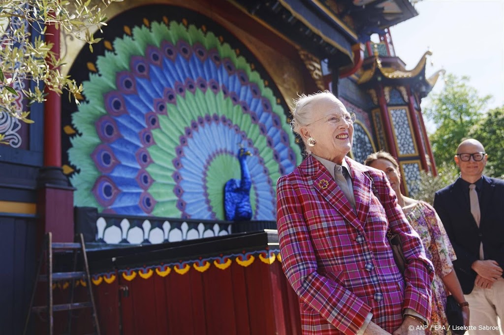 De Deense koningin Margrethe heeft woensdag in Kopenhagen een nieuw gordijn onthuld voor het Pantomime Theater in de Deense hoofdstad. De vorstin heeft het gordijn in de vorm van de staart van een pauw zelf ontworpen.