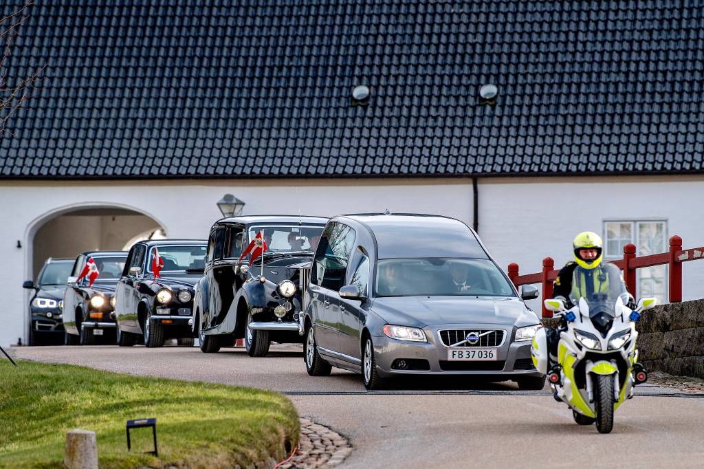 Koningin Margrethe en de koninklijke familie volgt de route van de lijkbaar in rouwauto’s, vanaf paleis Amalienborg naar de kerk. Bij aankomst bij de kerk staat een militaire kapel en wordt de kist naar binnen gedragen door tien officieren van de koninklijke lijfwacht onder begeleiding van een militaire kapel.