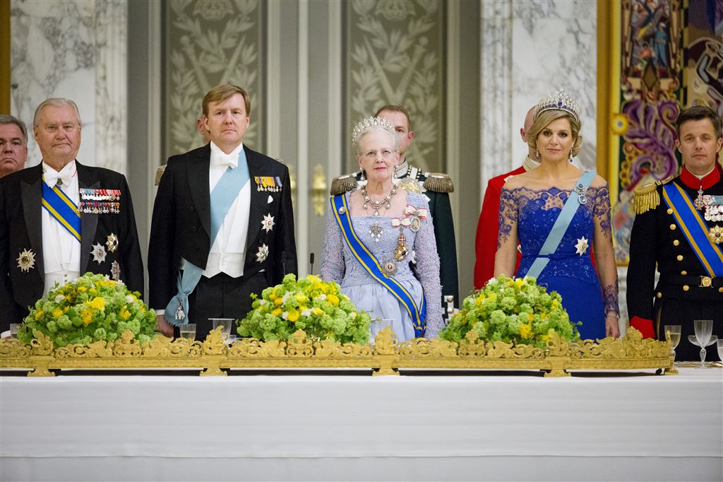 Koningin Margrethe had flink uitgepakt voor het staatsbezoek van haar Nederlandse petekind. “Het was een bijzonder moment op je inhuldiging te zien. We waren erg trots”, aldus de Deense vorstin. Koningin Máxima droeg voor het staatsbanket dezelfde kleding en juwelen als bij de inhuldiging van Willem-Alexander twee jaar geleden.