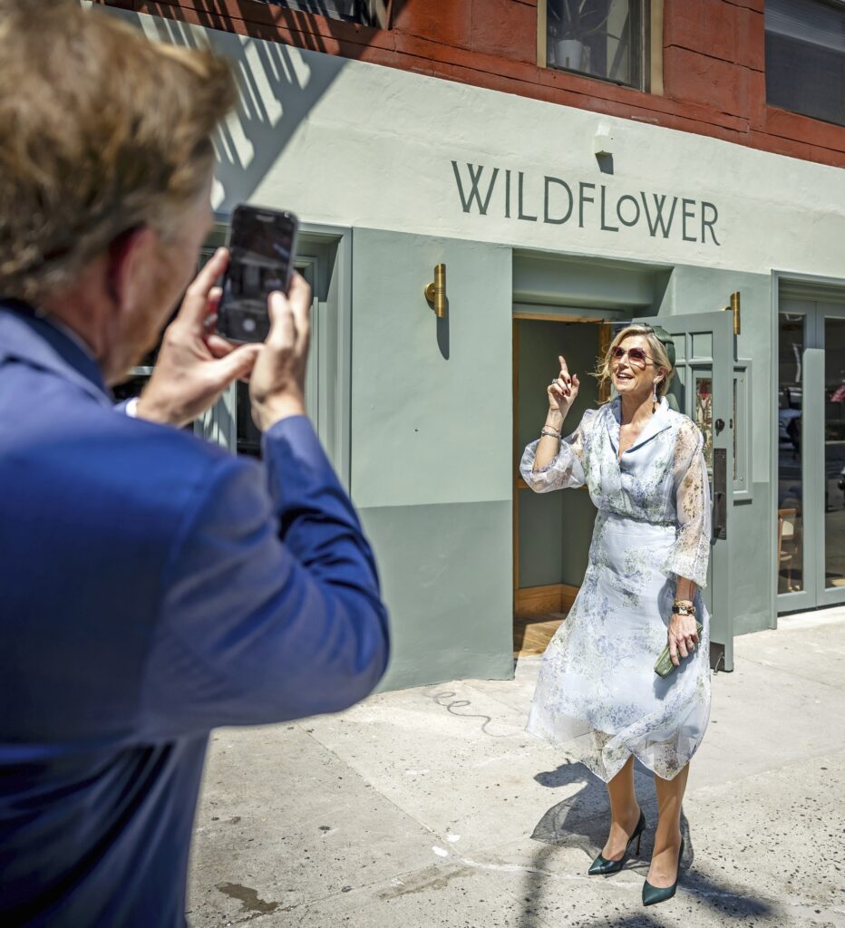 Het zijn namelijk de beelden die mensen graag zien: de koning en koningin als gewone mensen, als ze even uit hun rol zijn. Wat ik het leukste vind aan het fotograferen van het koningspaar, is dat ze altijd enthousiasme en interactie losmaken bij de mensen om hen heen, je ziet echt die verbinding waar ze op uit zijn. Of het nou bij een Amerikaans bedrijf is of bij een Nederlandse stichting. De momenten die dan ontstaan, zijn echt en spontaan. Juist dat wil ik graag vastleggen. Waarom Máxima nou precies voor het gebouw poseerde, werd me niet helemaal duidelijk. Ik hoorde later dat ze de foto aan iemand wilde doorsturen. Vermoedens waren dat haar zusje er woonde of dat de kleur van het pand zo mooi bij haar jurk stond. Ernaar vragen doe je dan niet, er blijft toch altijd een gepaste afstand.’