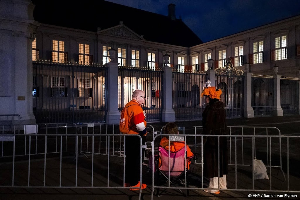 De eerste koningshuisfans hebben zich verzameld achter de dranghekken voor Paleis Noordeinde in Den Haag. Een ANP-verslaggever ter plaatse ziet dat er rond 07.30 uur een handjevol mensen is.