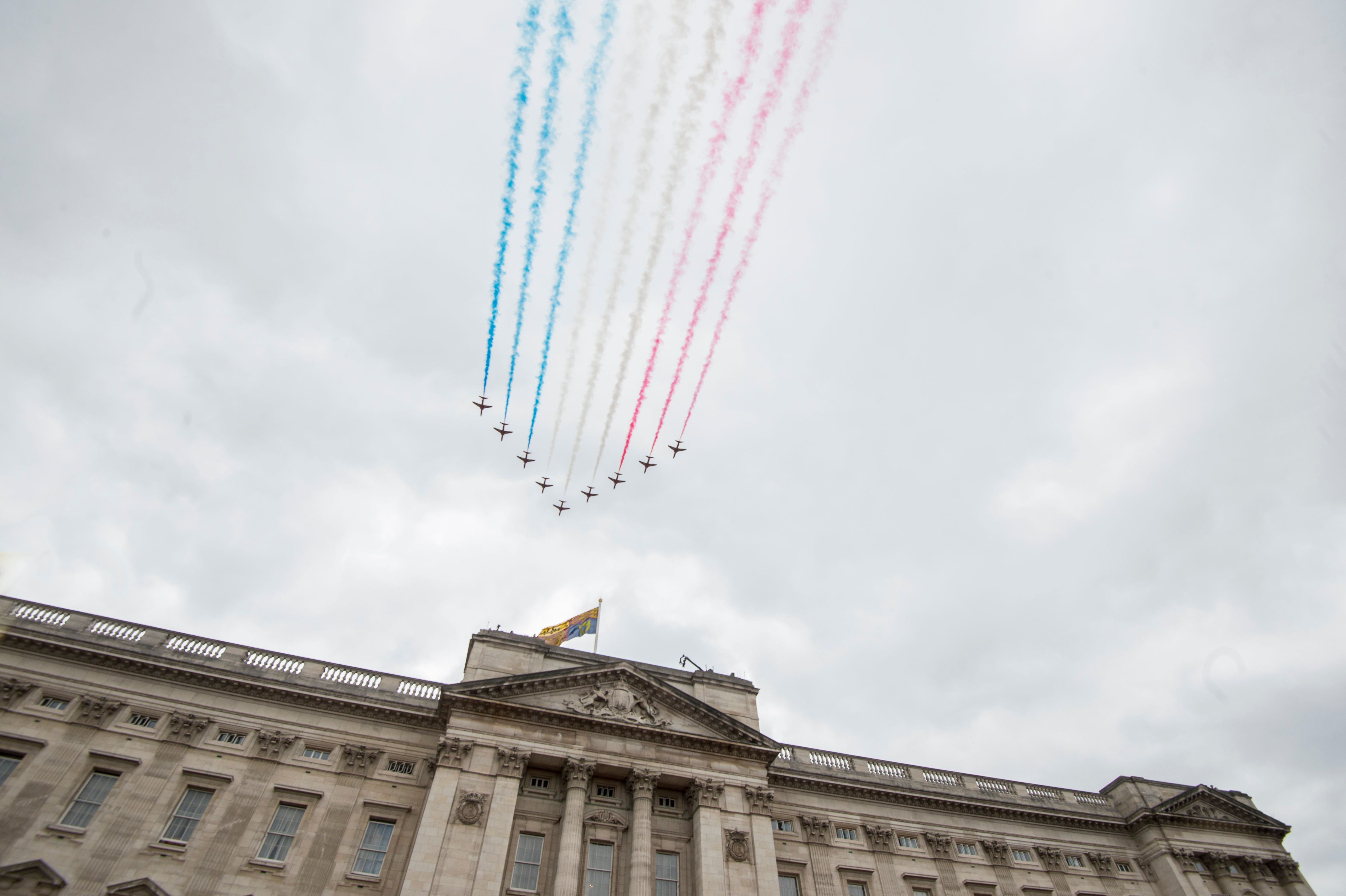 2018-07-10 13:10:02 The Red Arrows take part in a fly-past over Buckingham Palace in London on July 10, 2018 to mark the centenary of the Royal Air Force. The Queen and members of the royal family took part a series of engagements on July 10 to mark the centenary of the Royal Air Force. / AFP PHOTO / Paul Grover