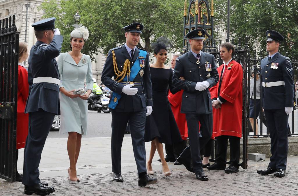De Britse koninklijke familie is dinsdag bijeen voor de viering van het honderdjarig bestaan van de Royal Air Force. Dat begon met een ceremonie in de Westminster Abbey, met koningin Elizabeth, prins Charles en Camilla, prins William en Catherine en prins Harry en Meghan.