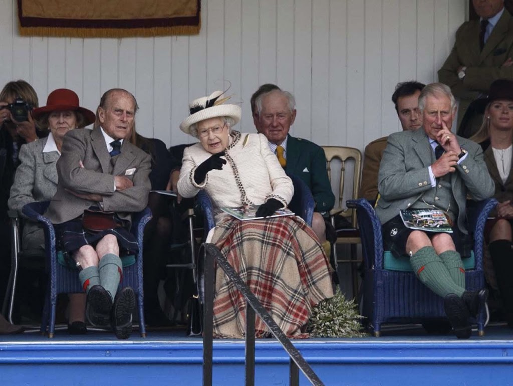 Ook dit jaar keek Elizabeth niet alleen naar het boomstamwerpen, touwtrekken en gewichtslingeren. Haar man prins Philip, die vorige maand met pensioen ging, oudste zoon prins Charles en dochter prinses Anne zaten naast de vorstin.