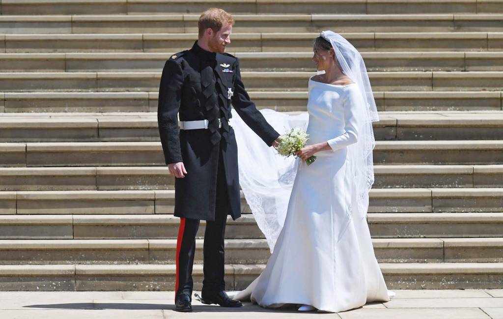 De veelbesproken trouwjurk van Meghan is ontworpen door Clare Waight Keller, verbonden aan Givenchy. In overleg met de bruid maakte de Britse ontwerpster een eenvoudige, zijden jurk met boothals. Op de bijna vijf meter lange sluier, waaraan langer is gewerkt dan aan de jurk, stonden ruim vijftig bloemen als symbolen voor de landen van het Gemenebest der Naties.