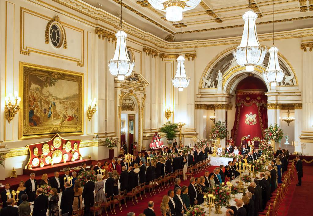 De Balzaal is overigens pas in 1914 door de toenmalige koning George V – de opa van Elizabeth – voor het eerst gebruikt voor een staatsbanket. De zaal heeft als voordeel dat er een lift is naar de keukens van Buckingham Palace, waardoor de gasten het geluk hebben hun eten warm opgediend te krijgen. Dat was in uitgestrekte paleizen niet altijd het geval.