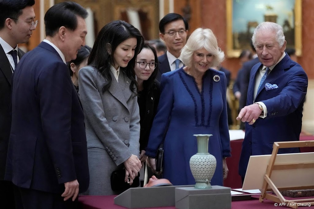 Koningin Camilla heeft een persoonlijk cadeau gegeven aan Kim Keon-hee, de vrouw van de Zuid-Koreaanse president. Het gaat om een sjaal met daarop de namen van de hondjes van Kim Keon-hee geborduurd.
